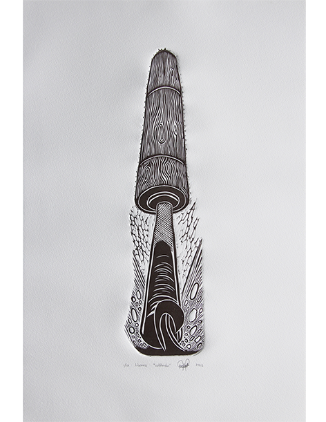 Linocut inscribed on 50 x 35 cm cotton academic paper. From the series Continuum. Signed by Prizmu. 2014. Close edition.